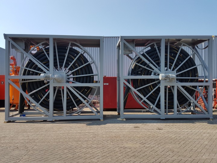 These two hose reels were specially designed and manufactured in accordance with the client's requirements. The hose reels are electric driven and include an electric driven winch.